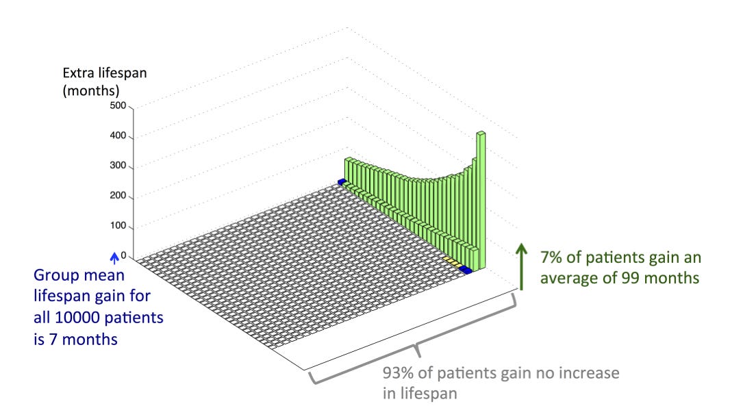 • Dr. John Mandrola is a local cardiac electrophysiologist who writes simply and compellingly about complicated topics. This Sensible Medicine article covers the nuance behind interventions that might give the average patient only days of extra life, while giving some patients years. He covers relative risk reduction, number needed to treat, and the surprisingly lopsided benefits of primary prevention, illustrated with clear graphics from this paper this paper. See the graphic below. You never know which patient you will be, whether you fall into the white or the green boxes.